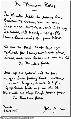 Here is the history behind the poem. Back in 1915 a young Canadian artillery officer, Lt Alexis Helmer, was killed when an exploding German artillery shell landed near him. His friend, serving with him in the same unit, Canadian doctor and artillery commander Major John McCrae was asked to do a reading at the gravesite since there was no available chaplain. McCrae wrote In Flanders Field to honor his friend and other fallen soldiers. It is deeply moving and so very sad, but a wonderful tribute to all those that gave their lives serving their country. (Right: Major John McCrae; Below: A copy of the original hand written poem.)