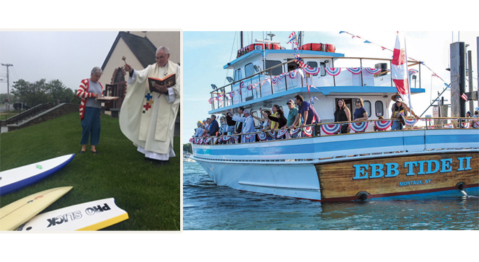 Pastor Joerger of St. Therese will be blessing surfboards, boogie boards, skateboards, and kiteboards at Sunday services in May. The Blessing of the Fleet event will also return to Montauk Harbor on Sunday, June 13th, with participating clergy from the Community Church and St. Therese as well as St. Luke’s in East Hampton and the Jewish Center of the Hamptons.