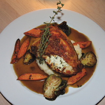 The natural flavor of the tender Short Ribs is accented perfectly by the sweetness in the vanilla sweet potatoes- which are unbelievable! Accompanied by roasted baby carrots, beans, celery, and pearl onions, the dish is memorable. If you enjoy a thick, juicy, flavorful Pork Chop, then this is how you want to eat it.