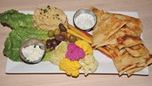 Hummus Plate; adorned with warm nan bread triangles, pickled baby carrots and curry cauliflower, feta cheese, and a dill spread; this homemade hummus dish is a must.
