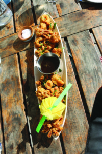 Duryea’s Lobster Deck on Fort Pond Bay offers one of the best outdoor dining locations in Montauk. The deck leading up to a long pier, with availability for boaters to tie up, is arranged with comfortable seating shaded by overhead sails that add to the relaxed seaside ambiance.