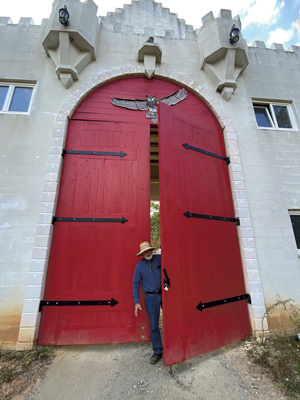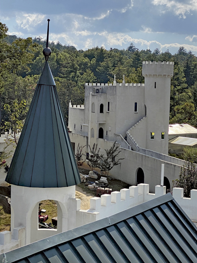 Lucy and Dan had met Bob Marthai and his wife Jenine, the owners of Uhucastle, through mutual friends one night while dancing the Polka at the Festhalle in Helen. Bob Marthai, an ex-psychologist, retired tall ship captain and naval architect had dreamed of building a castle in the mountains of Northern Georgia and has been working now on his dream castle for over a decade with his wife and daughter and a small crew. Uhuburg has twelve towers, a turret, three gatehouses, an eight story lookout tower, a great hall, cloistered walls with rampart and lower walkways, ten guest chambers, two apartments, a master chamber, tropical atrium, grotto, and two acres of courtyard gardens. Situated on a mountain knoll, the castle offers spectacular views from each of the walls and towers.