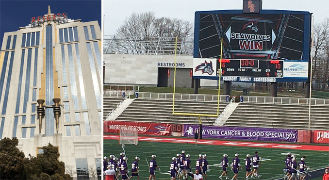 On Saturday March 27th I was at Stony Brook University’s LaValle Stadium for the matchup with Albany. The Albany Great Danes came in ranked 19th in NCAA Division 1 lacrosse. Stony Brook jumped all over the Danes from the opening face off. Caleb Pearson scored two goals in the first 4:48 of the game. Pearson opened and closed a three goal start. Connor Grippe (Setauket/Ward Meville) had the other goal. The Danes and Seawolves traded goals with Chris Pickel Jr. (Bayport-Blue Point) getting Stony Brook a 4-1 lead. Stony Brook kept scoring with two more and Matt DeMeo(Sayville) put the Seawolves up 6-1 with 5:22 left in the first quarter. Then the Danes woke up scoring five straight goals. Stony Brook would not fold. They scored to end the half 7-5. The Seawolves opened the 3rd quarter with a goal and it was 8-5 at 13:33 of the 3rd. The teams traded goals twice to make it 10-7 going into the 4th. Bayport’s Pickel Jr had the last goal of the 3rd and first goal of the 4th. His goal made it 11-8 and the local product had a “hat trick”. They traded goals again and Albany got it to 12-10 with 5:51 to play. That’s when Stony Brook shut the door. Stony Brook native Dylan Pallonetti (Ward Melville) scored making it 15-10 with 2:39 left. The Seawolves scored again for a 16-10 final score. They closed the game with four straight goals. As we go to press the Seawolves sit on top of the America East Conference at 6-1 (8-3) overall. They’re ranked no.14 in the country and are the first team to qualify for their conference championship.