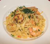Although I was tempted by the twin stuffed lobster tail special, we decided instead to go with the Shrimp and Scallop Scampi with Linguini. One of the evening specials, it was a unique version of the traditional scampi style. An abundance of tender shrimp and scallops were tossed with the scampi sauce, which was a bit thicker and less oily than usual, keeping everything nicely coated with the lemon-garlic flavor. The atmosphere and service, along with fine food and wine all made for an enjoyable evening.