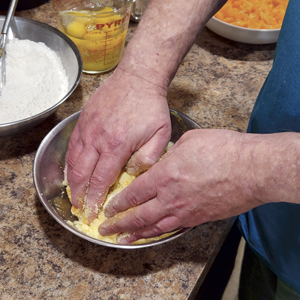 My first attempt left me basically with a yellow cake with pockets of orange zest and wet orange regions. So, I thought that the zest needed to be worked in ahead of time. How to do that? Mix the zest into the sugar. The abrasion of the sugar would release the oils of the zest and diffuse it into the sugar and spread even more orange flavor. The best tool? Your hands. Yep, it gets sloppy, but it’s worth it. Really get in there!