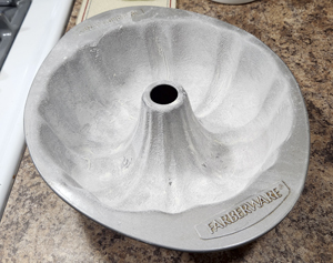 - Preheat your oven to 325°. Prepare your pan. Grease your Bundt pan with a tablespoon butter or margarine (I find margarine easier to use than butter for this), being sure to coat all surfaces. Mix together the tablespoon of flour and sugar. Use this to “dust” the greased pan. Set aside.