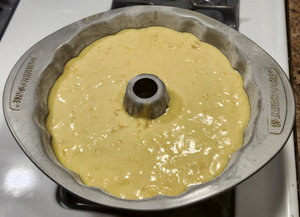 - Pour the batter into the prepared bundt pan, leveling the top. Tap the pan on the counter to release any trapped air bubbles.