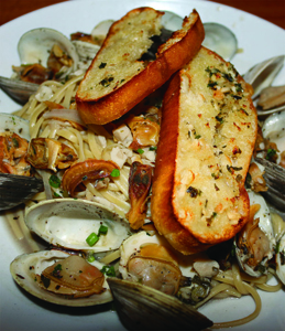 The mouthwatering Steak Au Poivre was served in a delicate peppercorn sauce- like my mom used to make- cooked to order and accompanied by crispy rosemary wedge fries and sautéed spinach. It was tender and delicious. As was the Linguini with a generous portion of whole and chopped clams in a garlic white wine sauce and served with toasted bread. We really enjoyed this creative Surf-n-Turf combination.