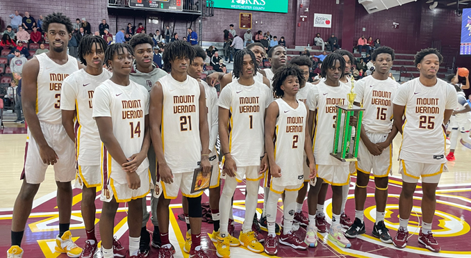 The 6pm match up was between defending Class AA NY Public School Champion Mt Vernon and Brooklyn Catholic Prep School Xaverian. Mt Vernon led 14-12 after the 1st quarter. Xaverian won the 2nd 15-11 to lead 27-25 at halftime. Mt. Vernon took the 3rd, 14-13 and Xaverian led 40-39 going into the final quarter. The game had 11 lead changes and was tied 12 times. In the final quarter Mt. Vernon MVP Dylan Colon hit two huge shots. The first was a big 3 to tie it 46-46 with 3:59 to go. MV’s Jaden Fearon scored on a lay-up with 2:08 to go putting MV up 52-48. With 53.4 seconds to go Colon hit his 2nd big shot making it 55-50. Mt Vernon won 59-52.