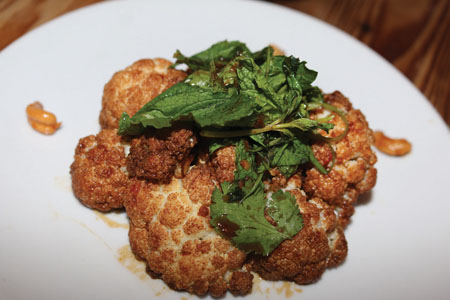 flavor and textures, with haricots verts and rice tuile adding a bit of crunch to this tuna dish. Served with crispy toasted bread, the creamy Burrata with dandelion greens, pistachio and pistou was fresh, full of flavor and a table favorite. Kung Pao Cauliflower takes cauliflower to an entirely new level, roasted with Thai chili and cashews and topped with a bit of arugula the flavor was outstanding. The Charred Octopus prepared with chili, celery and garlic was grilled to perfection- charred on the outside and tender on the inside.