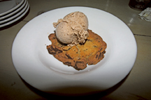 By this time, our fun and friendly waiter Starlin must have been exhausted from bringing out so many plates. Thankfully, he was able to handle one more trip with a decadent treat. Chef Frankie does it all! Along with the incredible dinner creations, he makes an array of desserts that are worth saving room for. I often threaten to start with dessert, just so I can be sure to eat it all. So, I love chocolate chip cookies…but only if they are warm, soft, gooey and chewy. Well, this large dark chocolate chip cookie topped with homemade walnut gelato is all of that plus; it’s just outstanding. And, as Frankie explained later, it’s gluten free.