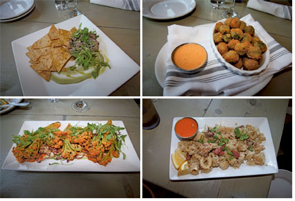 puree is another lovely blend of flavors. The buffalo sauce spice along with the gentle avocado flavor really works. For a fun tasty treat, try the bite sized Fried Olives; lightly coated Castelvetrano olives served with a red-pepper-goat cheese dip.