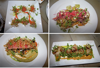 citrus flavor of the Tuna Ceviche atop the creamy sesame seed avocado and coconut puree, is served with white corn chip for an added crunch, is an amazing combination of flavor and texture-making this dish a unique and wonderful cross between a ceviche and a tuna tartare. While the Fluke Sashimi draped over a bed of honeydew, radish, scallion, shallot and harissa chili jam, is a clean, light fluke summer delight.
