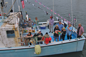 O’Grady, Capt. Gary Brady, Ginger Forsberg, John Fischetti. and Joe Ritsi, known as “Gloves.” Each year, a final wreath is also thrown in to remember all the fishermen and related people who died in the past years.