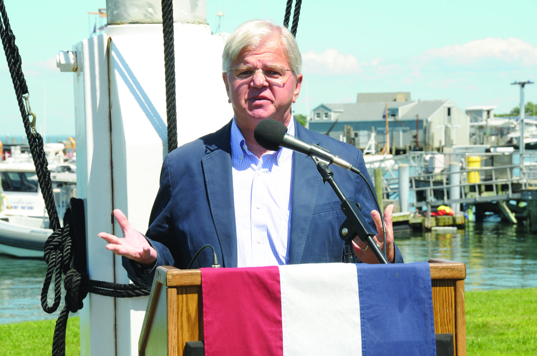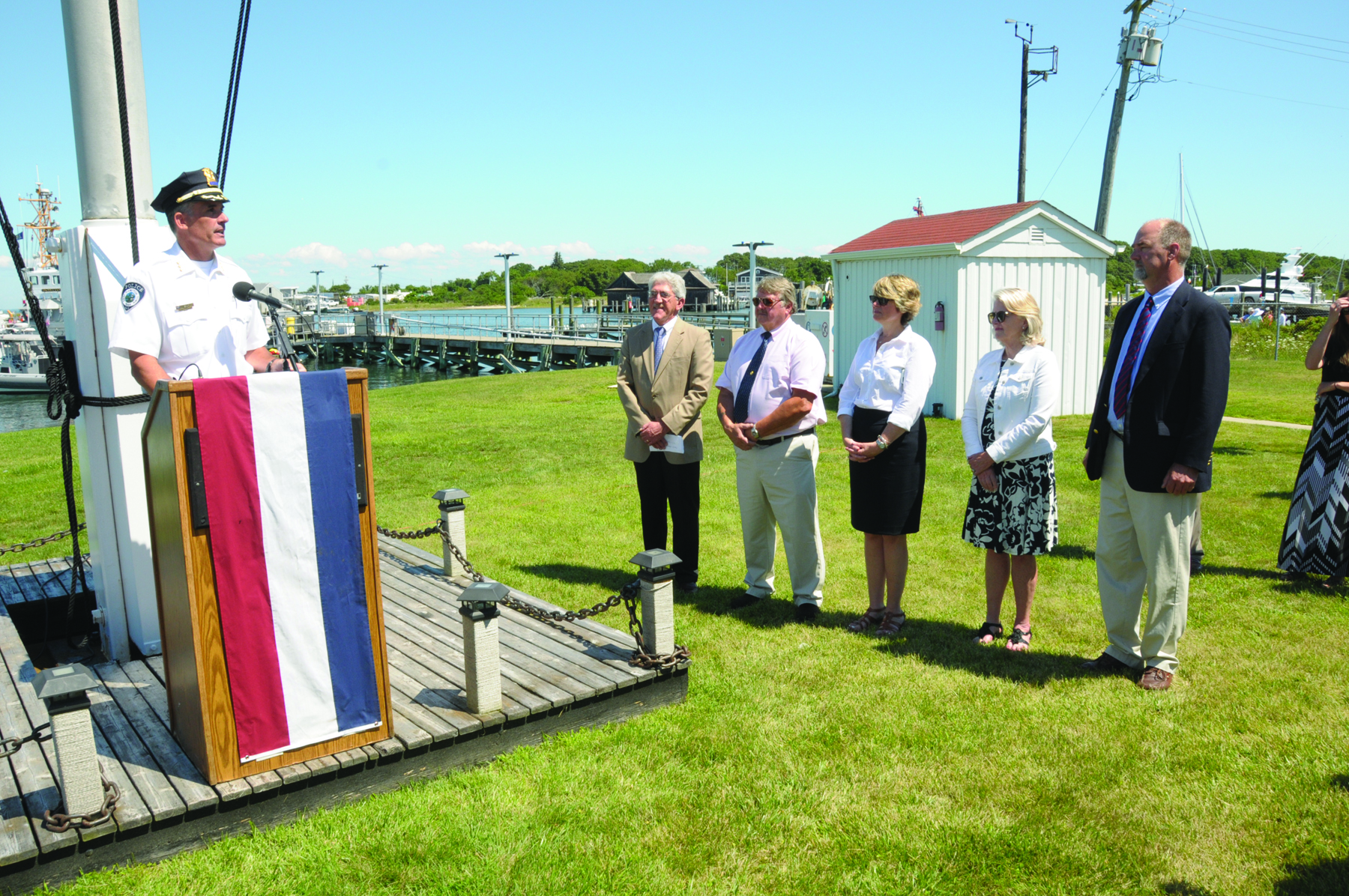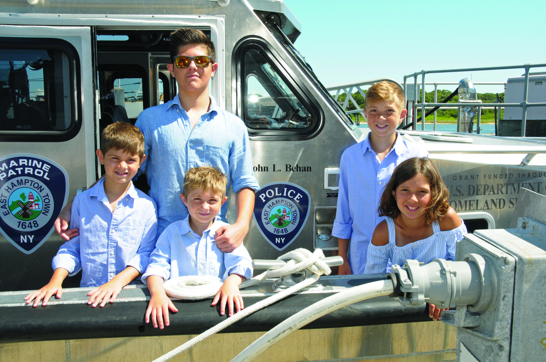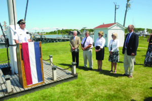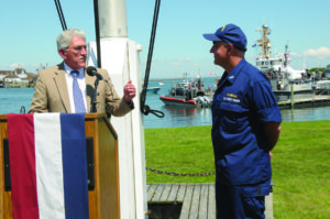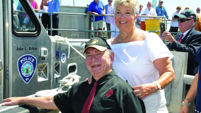 Not only was it an important moment in United States history on Wednesday, July 26th at Coast Guard Station Montauk, but it was also a dream come true for Montauk’s own hero John L. Behan. John beamed with pride as he broke the bottle of champagne on the side of the new Port Security Vessel in Montauk Harbor, officially commissioning the “John L. Behan”. According to the Town, “its purpose will be to assist the U.S. Coast Guard with its Homeland Security mission, thereby making Montauk a more resilient port, and to provide fire protection in Montauk Harbor”. Speeches by local dignitaries, including East Hampton Town Supervisor Larry Cantwell, EH Town Chief of Police Michael Sarlo, Captain Andrew Tucci of the