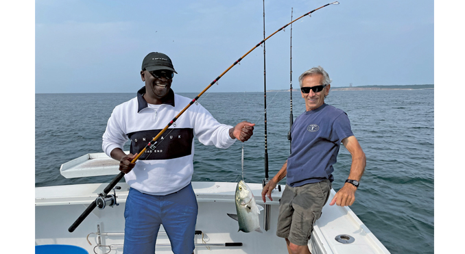 With birds diving we drifted some live baits and immediately got bites. All the bites were from the tail of the bait to the head, a telltale sign of bluefish. We boated a few blues and lost some hooks to the voracious feeders. We knew once the incoming tide died out it would be time to switch our target species. We decided to bottom fish north of the point. Captain Steve worked his way west trying different spots along the way. Black Sea Bass, Fluke, Sea Robbins and Skates were all caught. We ended the trip close to the harbor catching Black Sea Bass and an occasional fluke. Black Sea Bass are delicious and Cheikh was excited to eat the porgy and sea bass fillets I cut for him. It was a beautiful day on the water with wonderful people. It’s what Montauk is all about.