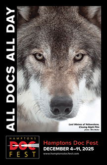 7:30 p.m. Closing Night Film “Lost Wolves of Yellowstone” (2024, 93 min.). Honored as Hamptons Doc Fest’s Closing Night Film at the Southampton Playhouse IMAX Theater is “Lost Wolves of Yellowstone” directed by Thomas Winston, who will attend the Q&A.