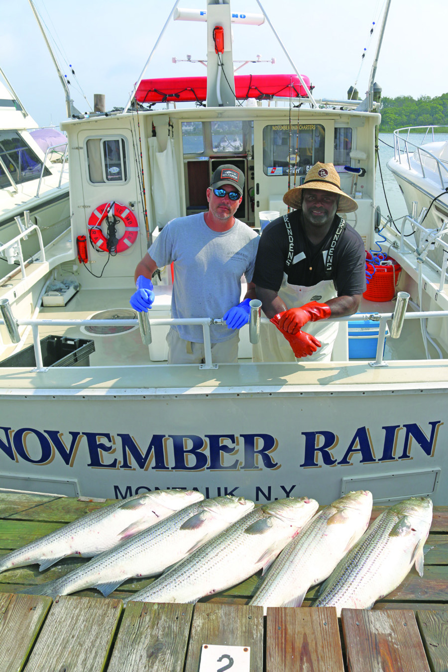 Although the sky was grey and we endured a bit of pelleting rain… boy did we catch fish. There were five of us, fishing three at a time, and everyone pulled in a 35-39lb. striped bass.