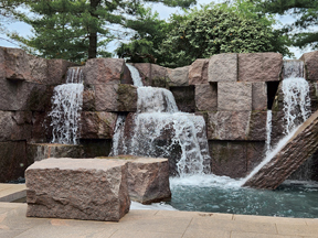 The rest of the memorial focuses on what happened during FDR’s presidency. Architect Lawrence Halprin described his design in his book The Franklin Delano Roosevelt Memorial. “In the FDR Memorial I hoped to evoke as many emotions and approaches as I could. I wanted the experience of this Memorial to reveal the dramatic story that unfolded during President Roosevelt’s four terms, the twelve years when he was president of the United States. His was a hero’s journey—from the urgency of his first term of office and the New Deal, through his struggles to overcome the Great Depression, through the trauma of World War II, and finally to his search for an honorable and everlasting peace.”