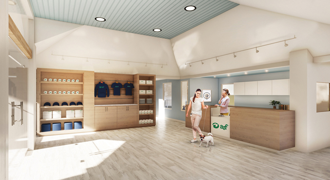 The new Richard Wells McCabe Welcome Center will improve ARF’s overall visitor experience with a modern look, inclusive of a new glass entrance, finishes, and entry system to maximize openness. The space will be outfitted with retail, interview, meet-and-greet spaces, and puppy room. A portrait of Mr. McCabe will be placed inside the lobby as a special commemoration of his generosity.