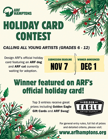 The Animal Rescue Fund of the Hamptons (ARF) is calling on the creativity of local young artists with the launch of its 2025 Holiday Card Contest. Open to all students in grades 6–12, the contest invites participants to design ARF’s official holiday card, spreading cheer while celebrating the animals waiting for adoption at the ARF Adoption Center.