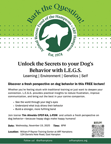 Join trainer Tim Almeida CPDT-KA, L-FDM to unlock the secrets to your dog’s behavior. Space is limited. This lecture is FREE to the public, but RSVP is required. Go to: https://arfhamptons.org/events/arf-calendar-of-events/