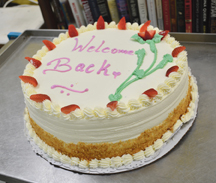 A huge red and blue poster on white background created by our own arts and crafts artist, Nolda Vivo with the writings, “Welcome Back To Nutrition Center” dedicated to Old Friends and New Friends, served as the backdrop for the long awaited, freshly baked, to-die-for, strawberry, short cake from the Montauk Bake Shoppe. Instead of the traditional, end of the month, birthday greeting, the cake was decorated with a “Welcome Back” saying, topped with juicy, red, strawberries. Thank you, Board Member Aster Stein, for hand delivering the cake, and for having the patience to drive on Main Street in July.