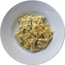 On a lighter side, the Crabmeat Pasta uses Paccheri which are large, hollow, tube-shaped pasta. Its large flat shape captures the essence of the gentle crabmeat accented with a light Meyer lemon and chili flake sauce, along with the sprinkle of toasted breadcrumbs adding another dimension of texture and flavors that pop in your mouth with each bite.