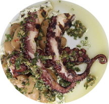 Not to be outdone, the perfectly tender Grilled Octopus is served atop a bed of pickled gigante beans with olive tapenade and herb aioli perfectly complimenting the gentle flavor of the squid. Although we savored each dish, it seemed the favorite was the crisp Flat Bread with goat cheese with a creamy whipped consistency, topped with paper thin apple and prosciutto slices, and adorned with baby arugula with a hint of pepper and grated cheese, all blending perfectly creating a wonderful experience of flavor and texture.