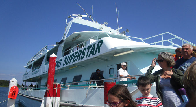 We boarded the 120-foot, steel Viking Superstar at 10 am, as Captain Jay Burke, of Montauk, ushered us on. Once inside, we enjoyed some hot coffee and “the best egg sandwiches,” as Capt. Jay says, cooked by Debbie in the galley. There is quite an array of breakfast foods, from oatmeal, to homemade muffins and breads, and on the return trip back, you can even have cocktails. You can also take your bike aboard, and you throw your luggage up front and take a seat either in the enclosed downstairs, or upstairs with a more open deck for better tanning. The trip takes only an hour and 15 minutes, and this passenger ferry is part of the Viking Fleet of fishing boats owned for many decades by Paul Forsberg and his family. There is also a new, wooden cruising boat, “The Viking Classic,” for sunset and cocktail cruises, as well as Lighthouse and Eco Tours.