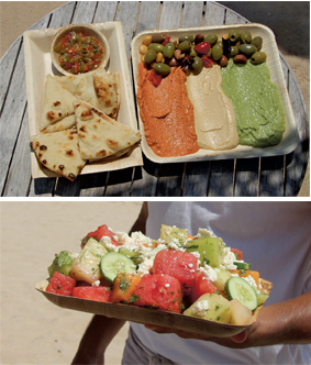 The tasty Muhammara [Middle Eastern walnut and roasted red pepper dip- savory, sweet, slightly smoky, with just a bit of spicy], Green Tahini, and Hummus spreads were delightfully enhanced when paired with the olives, peppers and bread.