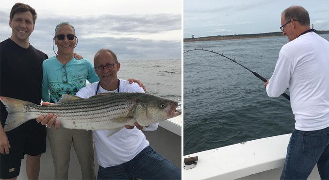 The transition from Summer to Fall always brings weather challenges. After three days of wind and high seas, Captain Dan and I were able to take Bob & his family out on Thursday September 17th. On a beautiful day with light west winds and an incoming tide, Bob and his family caught 5 different species all on one type of lure. They caught Bluefish, Porgies, Sea Bass, Sea Robbins & Striped Bass with diamond jigs as dolphins swam bye. It was magical.