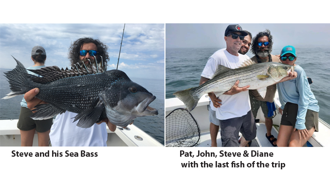Although tropical storm Fay had moved into Eastern Canada by July 12th, it’s remnants remained when we left the dock on Monday July 13th at 9:00am. Knowing the ocean was churning with heavy seas we headed northeast to an area producing some nice Black Sea Bass. I told Steve, Pat, John and Diane that we would start the trip bottom fishing on the north side. Later in the day with conditions allowing we would try drifting some live bait around the lighthouse. Fishing was tough in the beginning so I optimized our chances by having five lines baited and ready. Steve was working a jig. If one of the anglers came up with an empty hook, a new baited rod went down. If an angler wanted to take a break, their baited rod sat on the bottom in the rod holder being watched for bites. Lots of 13 & 14 inch sea bass came up. Sea bass must be 15 inches or bigger to keep. A few nice porgies came up too. Suddenly, Steve started grunting with the jigging rod. He had something digging hard to stay down in the 80 foot deep water. After a short battle he landed a beautiful Black Sea Bass.