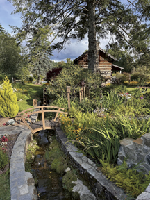 We’d admired the Azalea Garden Inn log cabin already two years ago when we stayed at The Meadowbrook Inn, its sister property. We picked up our keys at the front office from a friendly, young woman and told her how excited we were to stay at the cabin. The path that led to the log cabin was flanked with pretty Black-Eyed Susan flowers. The little front porch, with a neat swing, was surrounded by rambling flowers as well. The outside structure of the log cabin was authentic, right down to its split rail fence. So was the black iron mailbox by the front door. Inside the cabin we found a clean, well-maintained efficiency having a precious stone fireplace and a nicely furnished loft with a king-size bed that overlooks the main room. Azalea Garden Inn is positioned on 1 acre of award winning gardens with decks, covered solarium, streams, a waterwheel and a koi pond. All the flowering, well maintained gardens that surround the Inn are maintained by Craig, a handsome young man with two green thumbs. We parked our car close to the cabin and walked to town for lunch.