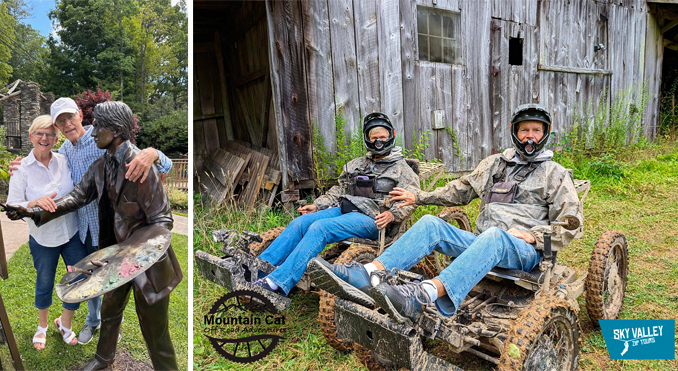 We went to bed early and slept safe and sound on the second floor of the cozy cabin. When 6 am came around the next morning I went downstairs to brew some tea, opened the door quietly and sat on the swing. Inhaling the sweet smell of thousands of flowers while sipping my tea and listening to the mountain world slowly waking up was magical. For breakfast we followed a path through the gardens and along a pond with lots of ducks chatting in the early morning light, to The Meadowbrook Inn where a nice hot buffet-style breakfast was served. Soon thereafter we were on the road to Sky Valley Zip Tours for a brand new adventure, riding Cat Off Road all electric, 4-wheel drive vehicles through the woods to experience the muddy sites of the mountains from the ground up! We were a group of five with JT, an experienced young man, as our instructor and guide. The oldest person in our group was Ms Rose, 78, incredibly fit and calm (I think). We may assure you that we experienced the thrill of a lifetime with these EAVes that allowed us to conquer challenging inclines, rocky paths, streams and other hidden landscapes of North Carolina’s High Country. Jack Sharp, a Brother In Christ, and the GM of Sky Valley Zip Tours offers traditional zip-lining and night-flights in the dark for adrenaline junkies of all ages.