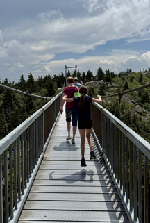 Our adventure began with a winding drive to Grandfather Mountain, that iconic 5,946-foot peak known for its sweeping views, wildlife habitats, and the famous Mile High Swinging Bridge. Grandfather is more than a landmark—it’s a symbol of endurance. In the Nature Center lobby, beneath the statue of Mildred the Bear, we met Landis Wofford and Molly Dowdle, Grandfather Mountain’s communications team. Over lunch at Mildred’s Grill, they shared how, in the aftermath of the flood, Grandfather Mountain provided vital support: volunteers, resources, and emergency logistics. — Crossing the Swinging Bridge, the metaphor became clear: like this town, the bridge may sway, but it holds. Standing high above the Blue Ridge, we saw how deeply nature and humanity are intertwined here. Afterward, we returned to the Nature Center and spotted a black bear napping peacefully beneath massive boulders, just one of many moments that stuck with us. Mildred the Bear, once the mountain’s beloved mascot, became a legend for her gentle nature and impressive longevity—she lived to 26, remarkable for a black bear in captivity.