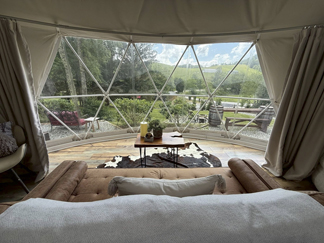 We stayed at Banner Elk Glamping, a mountaintop retreat minutes from downtown. The geodome is all about comfort and views: king-size bed, plush linens, a comfy sofa, extra-large bean bag, and panoramic windows looking out over vineyards and mountains. There’s a Keurig coffeemaker, tea kettle, refrigerator, and high-speed WiFi inside. The spa-style bathroom, accessed