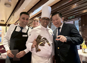Allow me to introduce some of the other stars of our crossing, like ms Rotterdam’s celebrated Hotel General Manager Errol Nelson. We witnessed on several occasions how the handsome, hands-on, always approachable, professional worked the crowd. And not to forget Nick J. Hollevoet, ms Rotterdam’s esteemed Cruise Director. The classy actor performed the ‘Behind the Scenes’ show on the World Stage almost single handedly until it was time to introduce the esteemed Captain Bas van Dreumel, the entire team and finally the staff in a Grand Finale. Soumik Mandal, one of the young Guest Service Associates took care of our needs on several occasions. Noven, is an incredibly creative florist on ms Rotterdam. Maroff Cadet Officer Floris Von Der By, who is 18 years old, is currently undergoing training on HAL’s ms Rotterdam. And our room stewards, Seno and Tony. They were the paragon of intuitive teams, providing unparalleled care and maintaining our cabin on the 11th floor to perfection. In the two-level dining room, Restaurant Operations Manager Rick Kolvoort excelled, along with all the wonderful hostesses, waiters and waitresses, but especially Mr. Wawan and Edwin. You guys rocked the boat! We will miss you all terribly, particularly the 3pm Afternoon Teas on Sea Days and the fresh, warm, and incredibly delicious almond croissants served with hot tea and a glowing sunrise.