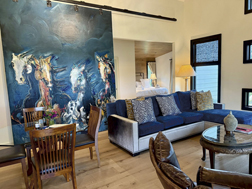 By mid-afternoon, we returned to the farm for a tour with Rachel Turchin, whose husband Jordan manages the property. She led us to the stables, introduced us to the horses and goats, and showed us the art gallery, game room, and mountain-view pool. Since the Turchin family’s purchase in 2017, every corner had been reimagined — pastures reborn as guest spaces, barns transformed into sanctuaries.