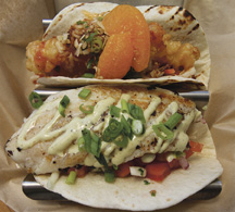 A trio of Street Tacos– Thai Chili Tempura Shrimp, Fried Soft Shell Crab, and a Grilled Day Fish. Each taco was dressed with greens and sauce for the style and were absolutely amazing. These are just three of the five choices all of which can be customized with the type of preparation of the protein and marinade. Another special was the simply grilled Swordfish with