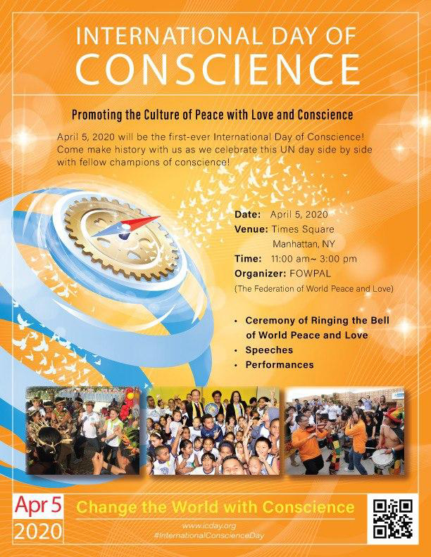 On July 25, 2019, during its 73rd session, the United Nations General Assembly adopted a resolution submitted by the Kingdom of Bahrain titled, “Promoting the Culture of Peace with Love and Conscience,” declaring April 5th the International Day of Conscience. After the United Nations’ declaration on July 25, 2019, each month FOWPAL is engaged in various events to promote the day, including the 68th UN Civil Society Conference in Salt Lake City, Utah, USA and events in Russia in August; celebrations in Los Angeles and San Francisco, the 17th World Summit of Nobel Peace Laureates in Mexico, and conferences at the UNHQ in New York during the 74th UN General Assembly in September; summits in Vienna and a peace trip to Turkey in October; the 20th International Conference of Chief Justices of the World in India in November; and the Grand Launch of the Alternative Development Organization Initiatives in Oslo, Norway in December. On April 5, 2020 FOWPAL comes to Times Square in New York City to promote the Culture of Peace with Love and Conscience.