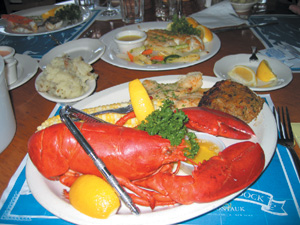 Although the restaurant was having its typical busy evening, our server, Mary, never made us feel rushed or that she did not have time for us. Having worked over 20 years at the restaurant, she was knowledgeable, friendly and more like a friend offering suggestions that she knew were guest favorites. Who could come to eat at Gosman’s without having the celebrated lobster? Having their own boats to catch the lobsters, Gosman’s Restaurant is always assured of the freshest catch Montauk waters have to offer. The top third of a menu page is devoted to lobster selections of all sizes, including jumbo, stuffed, and chilled. My first choice was the 1 _ pound lobster, until Mary pointed out the Shore Dinner on the menu. For only a few dollars more, this specialty included the same size lobster, Yellowtail flounder, a baked clam, corn on the cob and chive crushed potato. I couldn’t resist. Salads listed on the menu offered lobster, shrimp, grilled chicken, assorted seafood, vegetables and garden combos, as lighter fare. My husband had a harder time making a selection as he browsed through the entrees. Seafood reigns as scallops, crabs, shrimp, fluke, tuna and combinations of each were described in a creative array of offerings. Steaks, chicken and various beef entrees are also plentiful as well as children’s specials. The broiled Montauk Point fluke caught his eye and he teased about not catching it himself when he went to the Montauk Point fishing earlier that week. At least now, he could enjoy the elusive fluke that escaped his rod and reel.