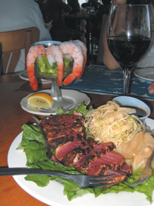 Picking our appetizers was easier, with tasty lobster bisque for starters and a cup of clam chowder. Both Manhattan and New England styles are available. A raw bar is available for those guests favoring clams or oysters. With an extensive list of appetizers that included baked stuffed clams, steamed mussels, stuffed mushroom caps, steamers, batter dipped fried calamari, crab cakes and calm casino, to name a few, there was something for every taste. The charred tuna sashimi was picked that night and it was a winner. Blackened, rare tuna slices with pickled cabbage, slaw, wasabi, pickled ginger and soy sauce gave our taste buds something to rejoice. The jumbo shrimp cocktail was perfect, as each bite into the tender, chilled shrimp was as tasty as expected.