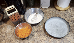 Preheat oven to 350°. Let eggs come to room temperature. Grease and flour a 9” round cake pan.- Shred your carrots on a box grater, or using a food processor. Set aside.