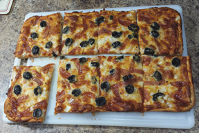 Move to a carving board and slice into as many slices as you like. Pictured is HALF OF THE DOUGH, ON A 10’ x 15” SHEET PAN…A “THIN, CRISPY CRUST”. THE SAME SIZE PAN COULD BE USED WITH ALL OF THE DOUGH AND MAKE A CHEWY THICKER CRUST.