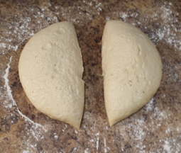 Pour the risen dough onto a lightly floured surface. If you prefer a thicker, chewier crust, use the entire dough…if you prefer a thinner, crisper crust, divide the dough into two. The second piece of dough can be frozen in a freezer bag, and defrosted in the refrigerator at a later date.