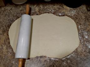 Roll the dough out to fit whatever pan you are using…the darker the finish the better…I use a twenty year old “cookie sheet” that has darkend over the years with the roasting of chicken thighs, pork chops, etc. Admit it, we all have one or two. If you have a pizza stone, etc., go for it!