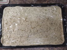 Sprinkle the Diced Garlic and Italian Seasoning over the top of the crust. Cover the pan with plastic and allow it to rest for 30 minutes. After it has rested, dock the dough (puncture with a fork all over so no air bubbles develop upon baking).
