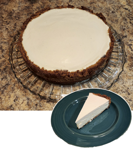 Well, all that was great, but it still cracked! What to do? Make up a topping, but something that wasn’t a fruit compote? What to use? Hmmm…something with a tang to it but not fruity? Sour cream! I flavored some sour cream and poured it over the top of the almost baked cheesecake and continued baking. I couldn’t believe how nicely it came out. It’s a looker and really tastes luscious. I hope you try this super easy to make treat. The hardest part of the entire recipe is the 12 hours you need to wait while it refrigerates to enjoy it!