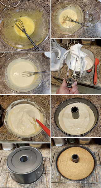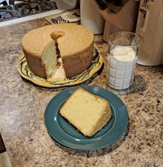 Sponge cakes, though I have baked them before, are not in my repertoire of frequently baked goods. I remember my first one was a disaster. I decided to grease the tube pan eventhough the recipe said not to. After all, how would I get it out of the pan? This was a big mistake! Since a sponge cake has no chemical leavening, it “rises” through the beaten egg whites attaching themselves to, and climbing up, the ungreased tube pan. Who knew?